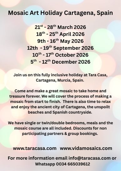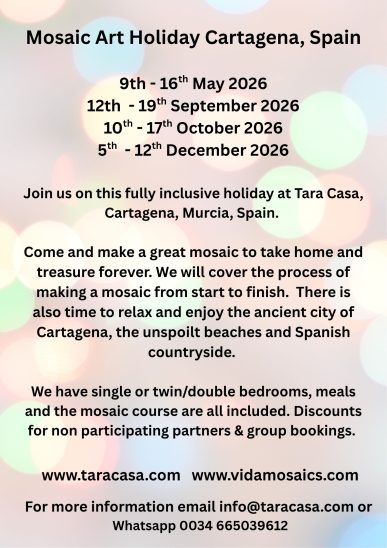 I spent a week at a mosaic retreat at Tara Casa in December 2025. I travelled from Devon, UK. This was the first time I had booked this kind of holiday and I wasn’t sure what to expect – to be honest, I was very nervous. Happily this holiday exceeded all my expectations, and for the first time in years I came home feeling much less stressed. I’m so glad I did it. I can wholeheartedly recommend a Tara Casa mosaic holiday and will hopefully visit again!