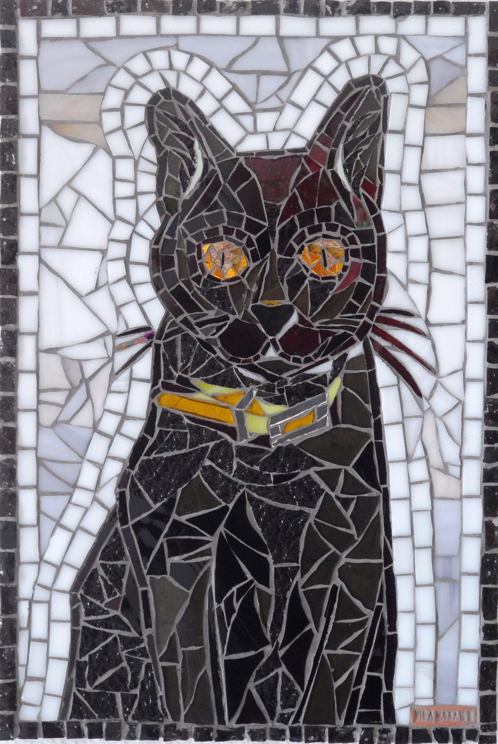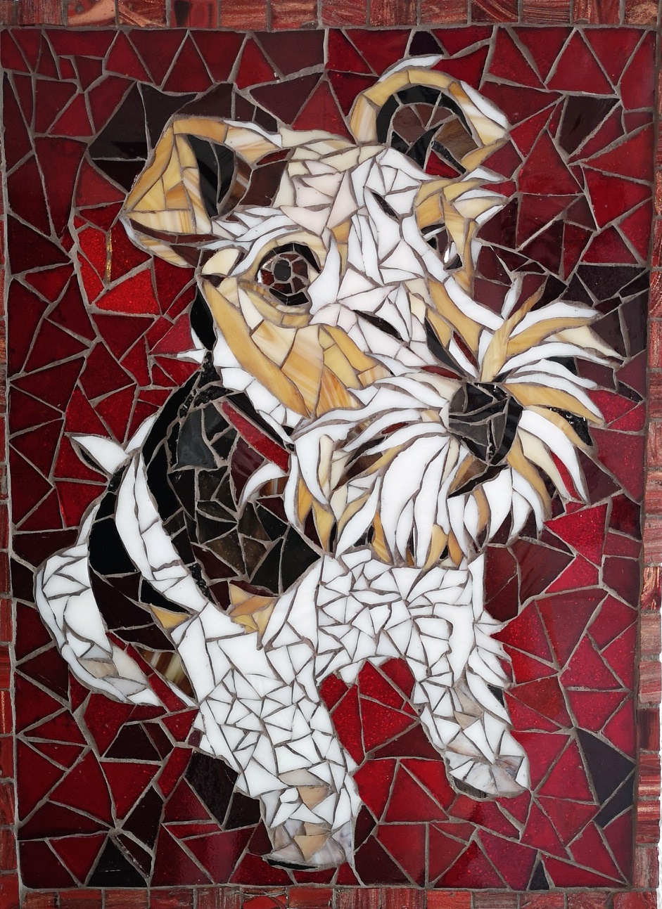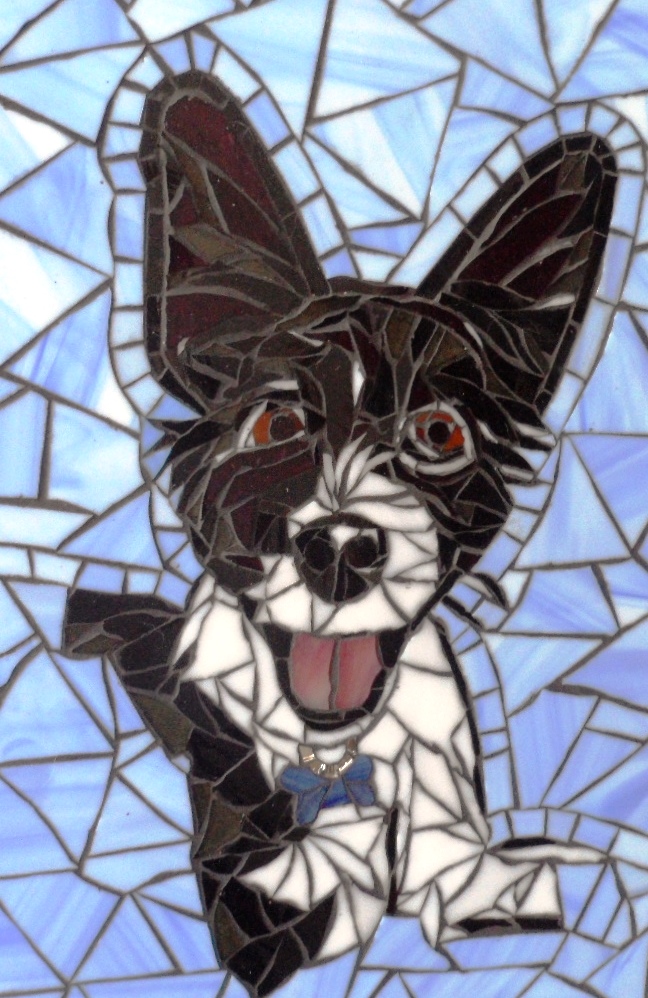 Pet Portraits in mosaic glass capture the love for your pet in glass mounted on wood.